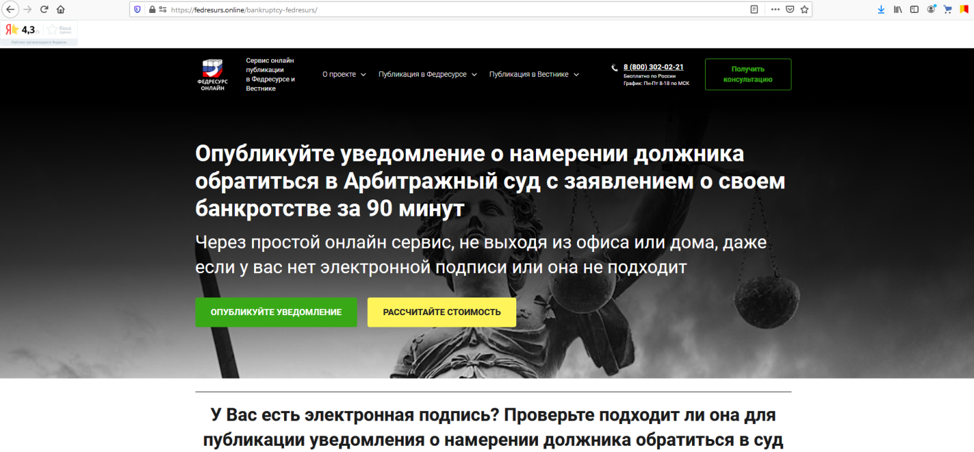 Если у Вас нет КЭП или она не имеет соответствующего расширения, а приобретать новую ради разовой необходимости нецелесообразно, Вы можете воспользоваться любым из онлайн-сервисов, предоставляющих услуги по публикации уведомлений на сайте Федресурс.