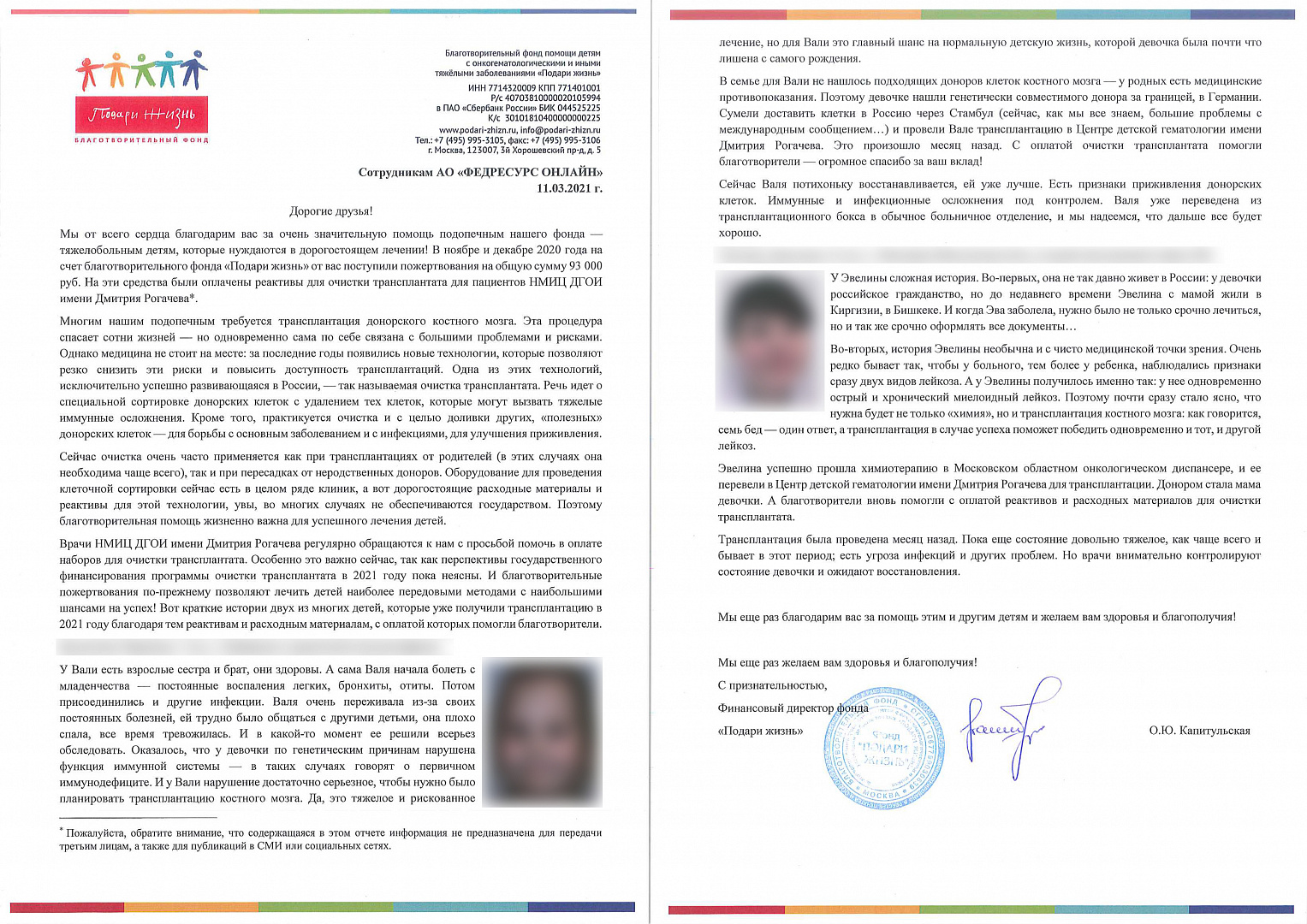 Коллеги, добрый день! Совсем недавно АО "Федресурс Онлайн" получил письмо из Фонда "Подари жизнь". С вашей помощью мы смогли сделать несколько крупных платежей на счет благотворительной организации, за счет чего уже несколько детей получили помощь. Ниже в письме вы можете прочитать истории нескольких детей, которым были проведены необходимые медицинские процедуры. И это благодаря вам в том числе. Спасибо!